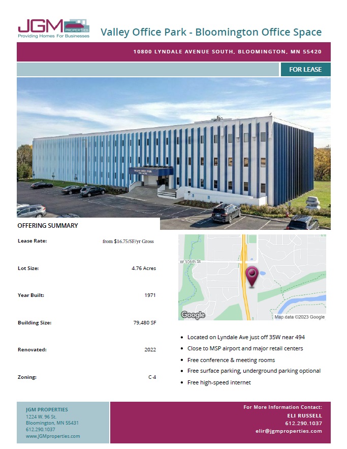 Call Eli at JGM Properties today and he would be happy to show you around the Valley Office Park property.